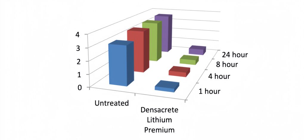 The following samples are used for comparison. A polished concrete sample finished with 50 grit resin pad treated with DENSACRETE LITHIUM PREMIUM. A second polished concrete sample treated with the normal lithium densifier – DENSACRETE LITHIUM, and thirdly an untreated sample as control. The treated concrete samples are cured for 7 days before tests are conducted. Figure 1 shows the capillary water absorption of the concrete treated with DENSACRETE LITHIUM PREMIUM. The results indicate the water absorption of the treated concrete is significantly reduced compared to that of the untreated concrete.